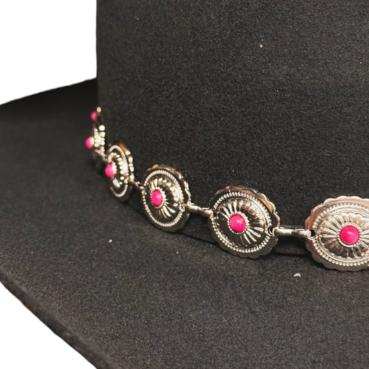 Hattebånd – Sølvconchos med rosa steiner