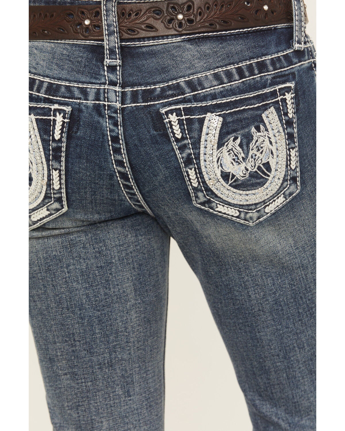 Perfekt for din lille cowgirls vestlige garderobe! Disse jeansene har et unikt brodert blomster design lang beina. Den enkle bootcut-stilen er behagelig og flatterende. På grunn av smidigheten til disse buksene kan ditt barn være komfortabel hele dagen i alle slags aktiviteter.