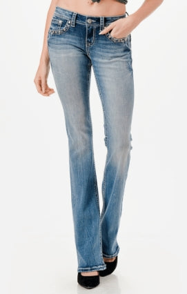 Et fantastisk tillegg til vår samling av vestlig klær. Denne jeansen har masse broderi og bling studs på lommer foran og bak, som garantert vil være en blikkfanger. Laget med lett passform og spenstigmateriale, du kan bevege deg komfortabelt hele dagen. Den mørkeblå fargen og bootcut-stilen gjør den til et allsidig plagg som kan kles opp eller ned.