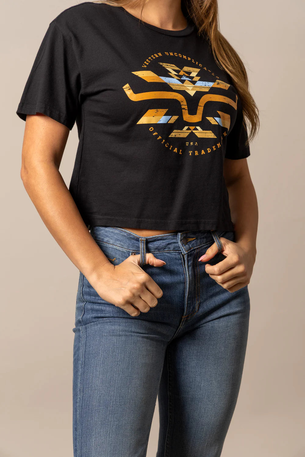 The Road Cropped Tee is a striking blend of western artistry and modern style. Designed in collaboration with Lucky B Design, it features a bold silhouette of a cowboy set against a desert scene, complete with cacti and a setting sun. The unique patterned overlay adds depth and texture, making it a wearable piece of art. Crafted from 100% ring spun cotton, this cropped tee delivers softness, durability, and a comfortable fit for everyday wear.
