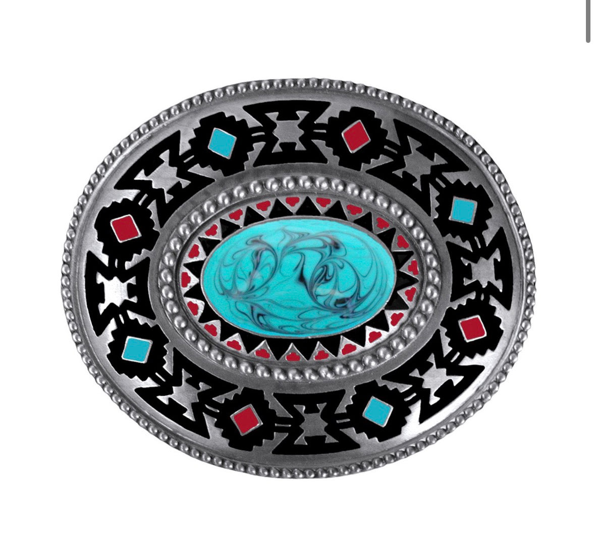 Oval beltespenne med sørvestlig (Southwestern) design, dekorert med geometriske mønstre i emalje i fargene korall, svart og turkis. Passer standardbelter med bredde opptil 2”. Produsert i USA.