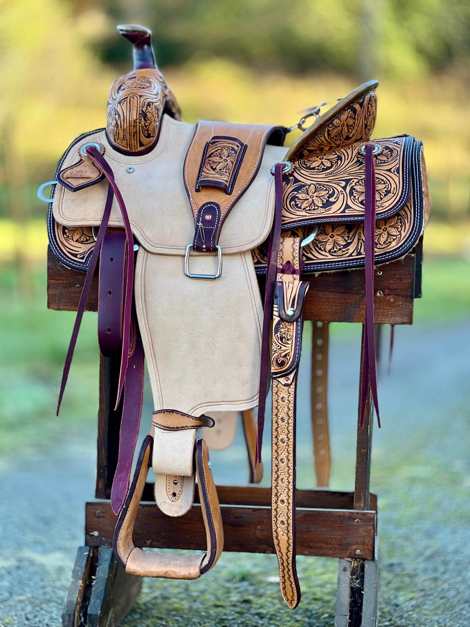 This saddle is built on a wooden rawhide covered tree and comes with a latigo, back flank, stirrups, back billits and offstrap.